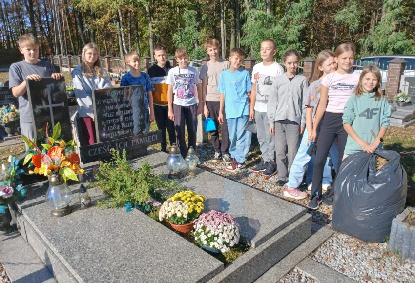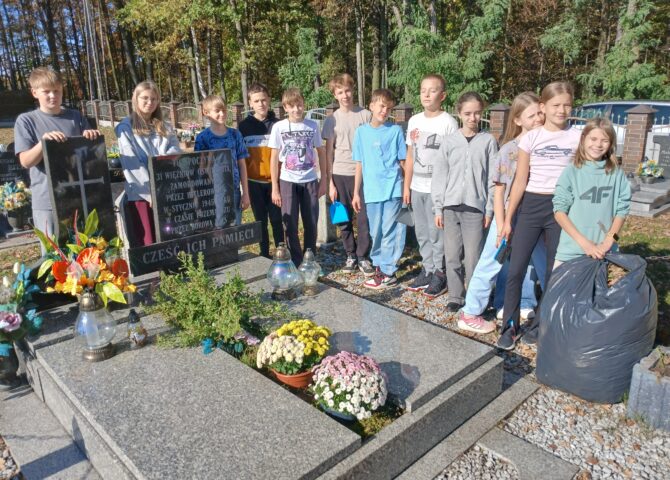 Uczniowie naszej szkoły pamiętają o ofiarach tragicznego marszu śmierci ze stycznia 1945 roku, których pochowano na miejscowym cmentarzu. Pod koniec października klasa 6a posprzątała mogiłę, a dziś w imieniu społeczności szkolnej klasa 8a zapaliła znicz oraz złożyła wieniec. Przy okazji młodzież wysłuchała opowieści o wydarzeniach z 1945 roku.